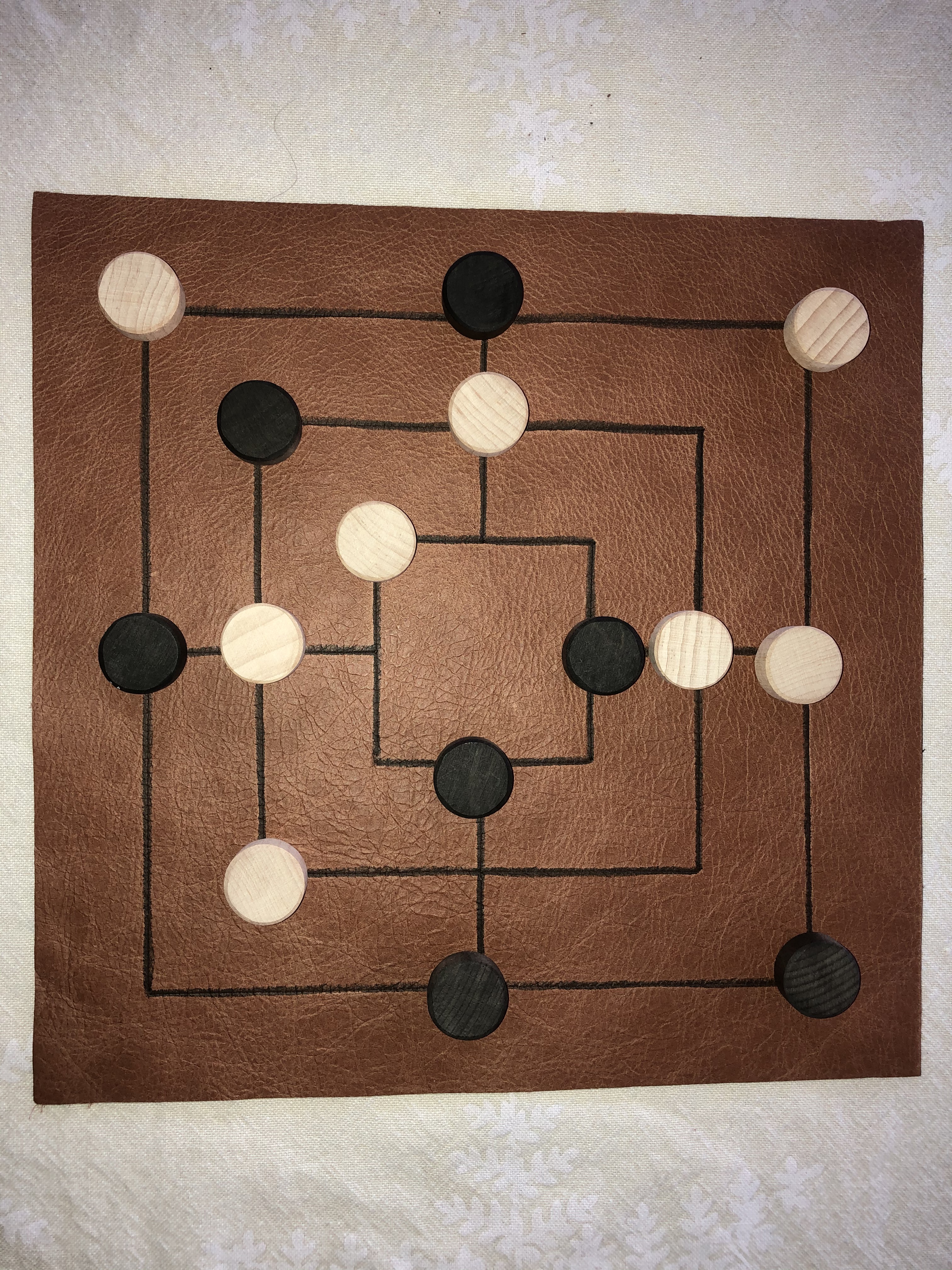 The game Nine Men’s Morris, also named as Mill, has been around for at least 1,400 years. It was very popular among the Romans who probably learned about the game through trade routes. The Romans brought this game to central Europe and England where it was very popular in medieval times. In colonial times it was played by soldiers during the revolutionary war and was also popular with children who played it with marbles by drawing the board on the ground.