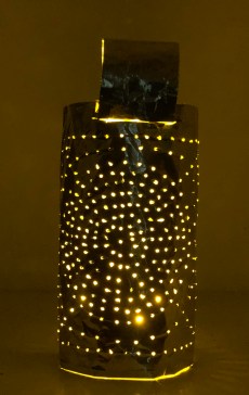 This project is inspired by our tinsmithing workshop and can be done at home in two ways. It can be easily crafted out of aluminum foil. No hammer and nails are needed. Even though an aluminum foil lantern is not very sturdy, it still makes for a pretty light.