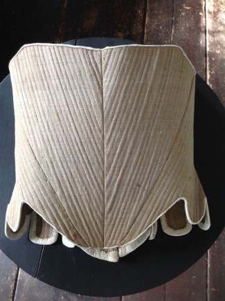 These 17th century “boned bodys” were made up of 2 matching “bodys” – a right body and a left body. The plural term “bodys” later became bodice. These “boned bodys” contained reed, bone, baleen or steel sewn into channels made in the fabric to support and aid posture. The fabric of pretty stays were lined with linen and the outer shell being of silk, for those who could afford it.