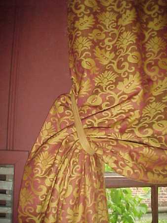 To find the best match for curtains for windows in the West Hall of the Hyland House Museum, Curator Pam Besse researched 17th and 18th century fabrics and window treatments. From historic research, it is reasonable to assume that Ebenezer Parmelee had the means to have imported wool from England for his draperies and bed hangings. After all, the colonists depended on England for fine