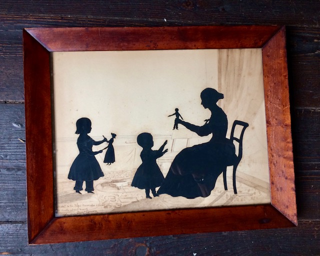 This Silhouette from 1842 depicts a domestic scene on how the artist Auguste Edouart saw Mrs. Burroughs and her children. The Silhouette picture has been enhanced by the use of watercolor in a very pretty and delicate way. The inscription reads: “Presented to the Misses Burroughs of Boston by their Humble and Obedient Servant.”