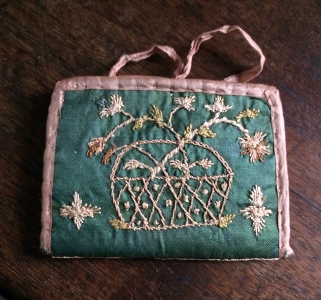 In the 18th century “hussif” (or “huswife”) sewing kit was usually made from fabric scraps of linen, wool and cotton and edged in twill tape. Aristocrats may have also used such fabrics as: moire, damask, chintz, muslin, brocade and silk. The kit is made of two strips of fabric – one constructed on top of another – a sturdy base cloth, with approximate dimensions anywhere from 3 to 8 inches wide by 12 to 24 inches long. A series of pockets were then stitched across its width. Stored inside these pockets one could find any of the following: snips or 17th century scissors, sewing needles, pins, linen thread, thread winders (made of wood, horn, mother of pearl or ivory), a thimble, a cake of beeswax, buttons, a cloth measuring tape, even a pincushion, in some. It folded on itself and tied close, all to fit neatly in one’s pocket and kept on one’s person at all times.